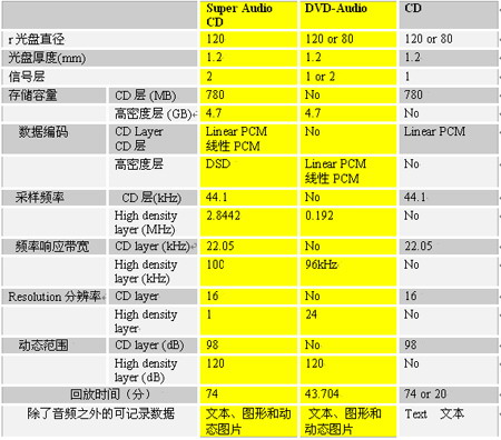 DVD-Audio提供了空前的高质量音频回放潜力,不过,DVD-Audio并不是唯一的高质量音频标准。Sony和Philips也已经合作开发了一个称为DirectStreamDigital(DSD)的竞争标准。1999年在日本公布的SuperAudioCD)与PCM格式CD和针对数字音频的DVD标准不兼容。?(SACD
