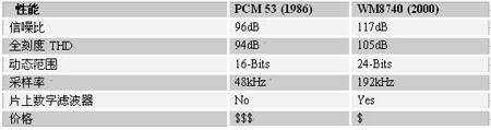 在过去的15年里,ADC和DAC系统的性能一直在稳定地增长。下面的音频DAC表简要列出了今天最先进的DAC和1986年最先进的DAC之间的性能比较。现在,将广泛的数字滤波技术集成进今天的DAC转换器中不仅在技术上是可行的,而且也非常经济。如WolfsonMicroelectronics公司的DAC器件WM8740具有完全支持最新DVD-Audio标准、CD和其它使用PCM格式数据的数字音频系统的架构。