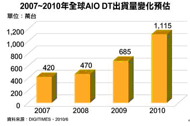 平价一体式桌上型计算机(All In One PC;AIO PC)在2009年创下685万台,成长45.7%后,DIGITIMES Research预估2010年将进一步提高至1,115万台,成长62.8%,展现新兴产品的强劲成长力道。