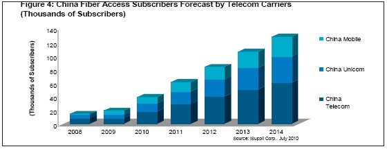 图4所示国iSuppli公司对于2008-2014年各家运营商的光纤接入用户数量预测。