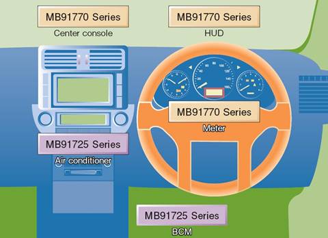 图一 仪表盘控制及车身控制MCU在汽车中的应用(以MB91770系列和MB91725系列为例)