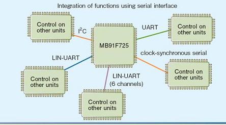 车用MCU连接的外围相当多样,而连接的接口可能是UART、频率同步串行、LIN-UART和I2C,因此必须具备弹性的接口连接能力。为了满足此需求,富士通将内置式多功能串行接口用作串行通信接口,并透过软件方式来切换上述各种接口,以灵活支持外部组件的通信规范,并提高系统设计的自由度。新系列MCU还提供LIN-UART的6条通道,从而能够与更多控制单元进行通信;其中MB91725系列因具有定时器功能的多条信道和A/D转换器,更容易达成各种功能的整合。请参考(图二)。