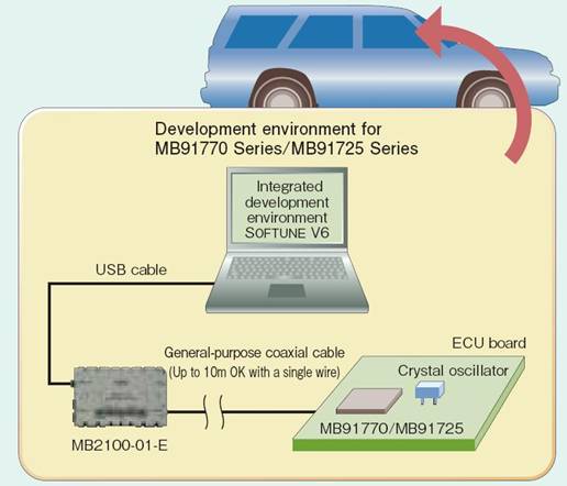 一般产品必须利用ICE主单元和验证用评估芯片来进行系统检验,为了降低验证的复杂度,我们为新一代MCU产品提供芯片上(on-chip)的侦错方式。它采用单线调试接口,可以实现汽车评估或一致性测试,并且能够利用通用同轴电缆、在高达10米的范围内实现小型ICE主单元和目标电路板之间的通信。这可以简化按照常规难以实现的汽车评估。