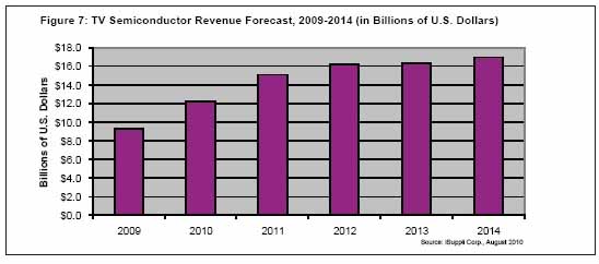 2009年电视半导体销售额高达93亿美元,由于液晶电视需要更多的半导体芯片支持各种高级功能,2010年销售额有望更上层楼。iSuppli公司的预测显示,2010年电视半导体市场将达到121亿美元。