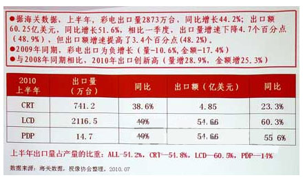 - 2010年上半年,彩电出口总量为2873万台,同比增长44.2%