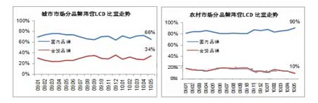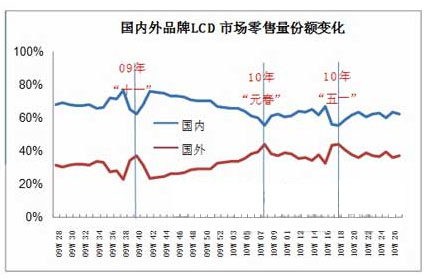 尤其在节庆期间,外资品牌大规模的降价促销,使得国内电视品牌城市市场的规模及利润大幅缩减。2010年五一前,外资品牌重点在32英寸的2499/2999元两个定价点,逐步扩张城市中低端市场。从五一开始,外资品牌将策略延伸至大尺寸,40英寸平板电视价格低至4499元,将内外资品牌电视价差降至500元以内,对国产品牌产生较大冲击。不过,在农村市场,国内电视企业面对家电下乡政策带来的巨大机会,可凭借一贯的本土优势全力弥补城市市场的份额损失,从而使其与外资电视品牌市场份额比例保持在7:3(见图3)。