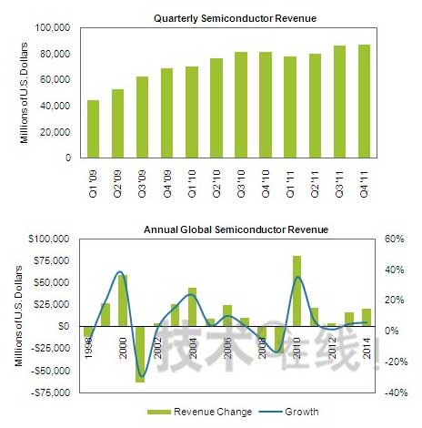 iSuppli从正面否定了对于此次快速增长所担心的“泡沫”和“二次探底”。关于泡沫问题,有观点认为,此前曾创下历史最高增长率的2000年出现了需求泡沫,所以此次的增长会不会也是泡沫。但是,iSuppli指出,2000年的增长是继1999年经济繁荣之后的产物,而此次增长的背景却是经济形势从2009年以前的经济低迷期开始的复苏,因此这两种情况“在循环本质上完全不同”。关于二次探底,iSuppli高级副总裁戴利·福特(Dale Ford)表示,“我不同意二次探底将要到来的观点”。他认为,从2010年下半年开始,2010年半导体市场将恢复到通常模式。也就是说,2010年第二季度将环比增加8.2%,达到峰值,第三季度将环比增加6.7%、第四季度将环比增加0.4%,出现减速,进入2011年后,由于通常的季节因素,将转为环比负增长。iSuppli预测,回到这种标准增长模式后,2011年的半导体市场将增长7%。