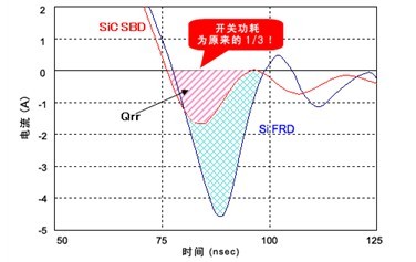 图2:相比SiFRD(碳化硅快速恢复二极管),SiC-SBD的功率转换效率大幅提升。(来源:ROHM公司)。