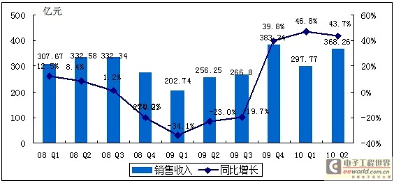图2008Q1——2010Q2中国集成电路产业销售额规模及增长