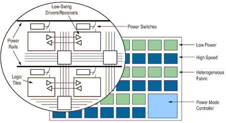 图3所示为具有上述某些概念的FPGA架构,其可编程异构架构由高速度和低功耗两个区组成。一个片上功耗模式控制器可管理各种降功耗模式,即深睡眠模式、悬挂模式和休眠模式。在架构内部,可以用专用的供电开关关掉每个逻辑块的电源。通过布线架构的通信信号流经低摆幅驱动器和接收器,以降低互连功耗。