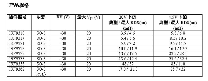 全球功率半导体和管理方案领导厂商 – 国际整流器公司 (International Rectifier,简称IR) 推出新系列-30 V器件,采用 IR最新的SO-8封装 P 沟道 MOSFET硅组件,适用于电池充电和放电开关,以及直流应用的系统/负载开关。新款 P 沟道器件的导通电阻 (RDS (on)) 为 4.6 m?至59 m?,可匹配广泛的功率要求。P 沟道 MOSFET 无需使用电平转换或充电泵电路,使其成为系统/负载开关应用非常理想的解决方案。