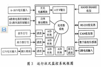 “运行状况的监控系统”具备采集动力电池的电流、电压、温度,以及车辆的刹车信号、离合器压力信号、行车速度等,准确地获取这些信号是实现混合动力驱动汽车的关键所在。图3是“运行装况监控系统”的一个结构框图。该系统采用两片TLE4275和一片LM2577作为系统的供电???,输入电压为6~18V,可满足车辆启动和特殊情况下导致的蓄电池输出电压不稳定而导致的监控系统瘫痪。