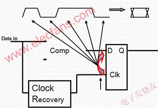 图1:串行数据中的抖动,每个时钟的数据级、上升沿和下降沿都在D处表示出来。数据锁存是数据通信的关键环节,在示波器上以眼图形式显示。