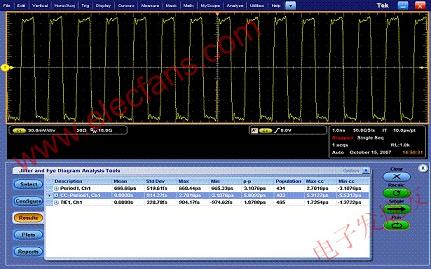 如果要测量在高信号速率时构成Tj的各分量,应采用本底噪声低、频率响应平稳、抖动测量底限低和触发抖动小的仪器。例如,ONSemiconductor发现在检定其高速ECL器件时,需采用系统抖动<200fsRMS而且带宽较宽的仪器。芯片设计者发现几个ps的信号移位,甚至是在fs范围内的移位,也可能干扰发送(TX)和接收(RX)性能。