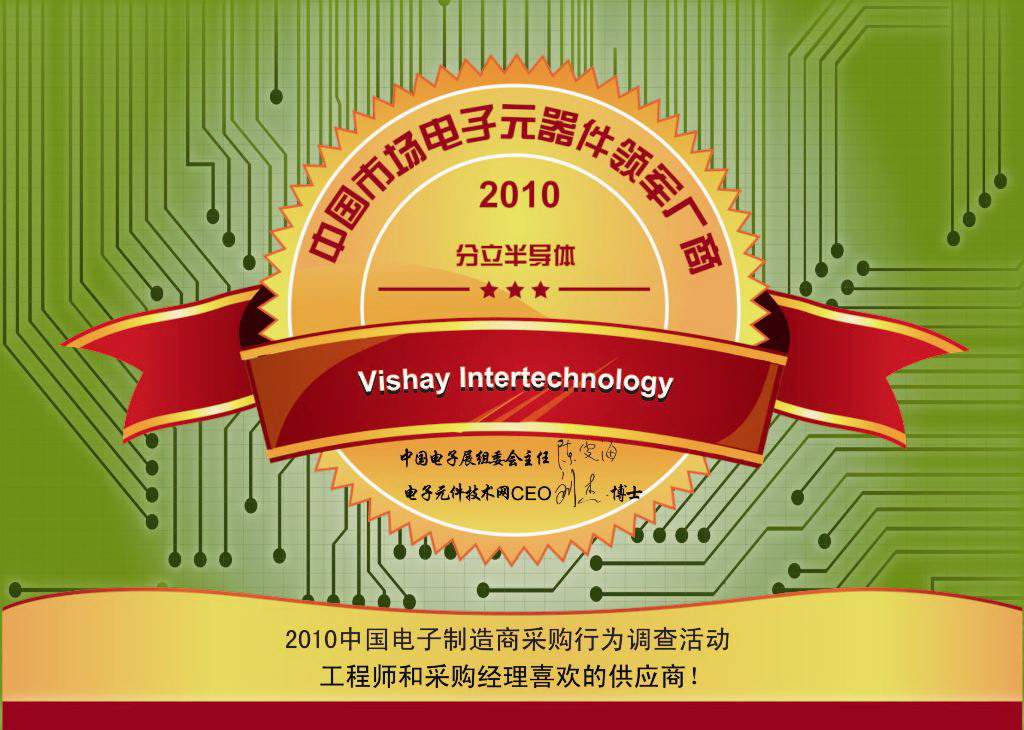 作为调查的一部分,经过审核的调查对象对候选企业的公司形象及品牌知名度、交货期、产品组合、技术支持、产品质量、技术领先性、供货能力和产品性价比8个方面的表现进行打分。主办单位根据总分评出获奖企业,Vishay因在“分立半导体”类获得的高分而获奖。