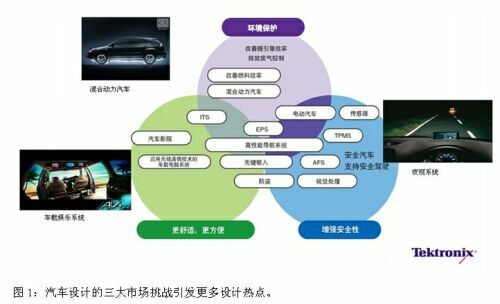 然而,面对日益复杂的汽车设计需求,特别是要推出中高端和商用的新能源汽车之时,自主创新和开发之路并非坦途。泰克科技的专家曾在不久前举办的一场汽车电子技术论坛上以拥有“100多个ECU、软件代码已经达到700万行”的丰田Lexus460汽车为例,强调了电子部件在汽车特别是高端汽车中所占据的比例越来越高。“如图1,汽车电子关乎目前汽车设计的三大市场挑战,即如何满足生态(环境?;ぃ⒏媸史奖愫驮銮堪踩缘囊?,而围绕解决这些挑战的系统和子系统正是目前汽车电子设计的热点和难点。”他指出。“而局域网、动力系统、电子控制单元和数字RFID的应用在改善汽车生态学、安全性和舒适性方面扮演了重要的角色。