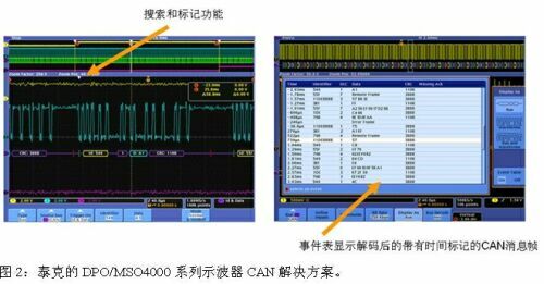 对于汽车中常用的CAN、LIN这类低速串行总线的调试,泰克的DPO/MSO4000系列示波器提供了简单、易用、完整、高品质的触发、捕获和解码解决方案。如图2,该示波器系列提供了搜索和标记功能,可在事件表显示解码后的带有时间标记的CAN消息帧,这一功能是其他竞争性产品所不具备的。