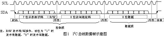 如图1所示是常见的I2C总线上传输的一字节数据的数据帧,其总线形式是由数据线SDA和时钟SCL构成的双线制串行总线,并接在总线上的电路模块即可作为发送器(主机)又可作为接收器(从机)。帧数据中除了控制码(包括从机标识码和访问地址码)与数据码外还包括起始信号、结束信号和应答信号[4]。