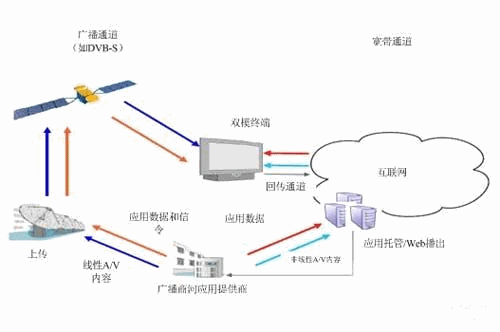 对运营商而言,数字电视数据业务可能来源于广播信道(卫星、有线或无线等)和/或宽带信道(互联网、或其它的IP通道)的信号,音视频与数据可以不加区分地由这两个通道分别接入,在带宽限制的情况下,广播通道可以用来播送高清节目,而宽带的使用形式就会有很广,如视频点播、时移、信息浏览、电子商务等。