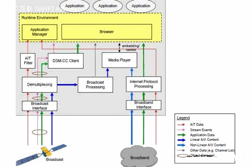 通过宽带通道(BroadbandInterface),双模终端能够连接到互联网或其它的IP网络。它提供了应用数据接收的第二个通道,以便与应用提供商的服务器连接。这个连接用于接收非线性音视频内容(如内容点播业务)?;チ榇砥鳎↖nternetProtocolProcessing)组件包含了处理来源于互联网等IP网络数据的功能,通过这个组件,应用数据提供给运行环境,非线性音视频内容传送到媒体播放器(MediaPlayer),包含在应用中解析、呈现与播放。