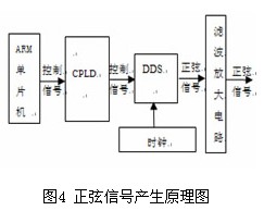采用DDS技术在当前的测试测量行业已是一种主流的做法,其频率精度可随相位累加器的位数而定。本系统采用单片机+专用DDS芯片的方式产生正弦信号,其原理如图4所示,ARM单片机向CPLD 发出控制命令,CPLD 在时钟下译码后产生DDS的控制信号,产生出相应频率的正弦波信号,该正弦信号经过滤波放大后,输出相应幅值的正弦信号。