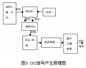 曲轴位置信号(CPS)是PCM控制点火系统中最主要的传感器信号,为适应多种PCM的需求,设计采用CPLD和DA的方式产生。CPS信号产生原理如图5所示,在EPROM中存有一个周期的正弦表数据,当需要产生 CPS信号时,ARM单片机对CPLD进行设置,CPLD根据接收的控制命令,通过时钟计数,产生读存储器的信号,并向EPROM提供合适的地址信号和控制信号,EPROM输出相应地址的数据,经D/A转换,变成单端CPS模拟信号,然后经滤波电路和单端转差分处理电路,输出CPS差分信号。在实际的电路实现中,对CPS信号的控制可由计算机通过CAN总线向ARM发出控制命令进行设置,因此,即使ARM芯片在运行过程中复位,电路仍能输出正确的CPS信号,以确保测试周期的正常进行。
