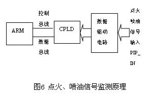 点火和喷油信号是汽车发动机中的关键信号,其周期和时序直接关系到汽车的运行状态,因此监测它们的周期和时序尤为重要。本系统监测原理图如图6 所示,对于点火信号的监测,主要是监测它与CPS信号的同步,以及两个或四个点火信号之间的时序关系。当CPLD寻找到点火信号与CPS同步的起始点后,根据输入的PIP_IN信号,对各点火信号进行计数。每当一个点火周期完成后,在下一个点火周期向ARM 单片机产生一个中断信号。该中断信号触发ARM 单片机进入中断处理程序,在该中断程序中,ARM单片机读入对各点火信号的计数值,判断点火信号的时序和周期,并设置点火信号正常与否的标志。对于喷油信号的监测,主要是监测它与CPS信号的同步,以及它们之间的时序关系。当PIP_IN信号中四个喷油信号中任何一个信号的下降沿到来时,CPLD都会监测其它三个喷油信号的状态,如果其它三个喷油信号的状态正常,即给出喷油信号正常标志,反之给出喷油信号异常标志。