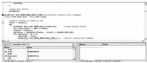 以配置开始指令的发送为例,从图3图4两图中可以看出软硬件交互过程中的指令发送方式,在VC++中单步调试,发送一个开始指令0x01到配置命令寄存器地址0x01,通过硬件??榈慕涌诙?,用嵌入式存储器SignalTapII中捕捉到LA的数据为1h,LD上的数据为1h后ConfigStart寄存器置高,配置开始。