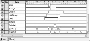 图4中ADS_N、BLAST_N、LWORD_N、LHOLD、LHOLDA是LocalBus的接口信号,ConfigEnd和ConfigStart是分别代表配置结束和配置开始的标志寄存器,LA是接口的地址信号,用于??橹锌刂萍拇嫫鞯难爸罚琇D是接口的数据信号,用于指令数据的发送和数据的回收。