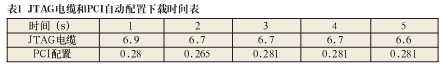 从表1的数据对比中可以看到,基于PCI总线的自动下载配置方式要比基于JTAG电缆的下载配置方式提高超过20倍的速度,如果使用基于JTAG电缆对某大容量的FPGA下载需要近20分钟的话,使用PCI下载方式则只需不到1分钟的下载时间,具有明显的速度优势,大大节省了FPGA测试中的数据配置时间。