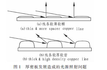 在PCB行业的发展中,目前存在以下3大趋势,即线条更细、线距更小密度更高、高度差更加明显。本文使用的厚密板即是该趋势的集中体现。如图l(a)是普通光源应用在线距大、厚度小的PCB上的光线路径。图1(b)是普通光源应用在线距小、厚度大的PCB上的光线路径。