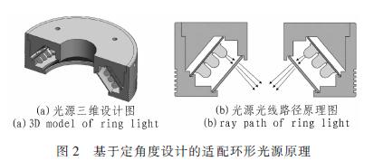 通过前面的分析可以看出,要想解决厚密板的光源照射问题,同时能够保持精度的稳定与提升。必须基于厚密板的几何和光学特征,有效地解决入射角度选择以及适合应用对象的环形光源参数配置,基于此,本文提出基于定角度设计的适配环形光源,其基本原理如图2所示。