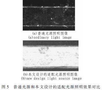 从图5可以看出,使用普通光源仅仅能将上线宽附近的法线方向接近水平45°的线路照亮,如图5(a)中两根横向亮线。由于厚密线路对光线的强烈遮挡作用,基材部分亮度非常低且接近下线宽亮度,肉跟几乎不可分辨其差别。而由于线路表面的反射接近镜面反射,导致到达线路表面的光线不能进入镜头的收光光锥,上线宽以内亮度也非常低。图像没有将PCB线路信息有效记录,分析下线宽的精度很低且上线宽有固定系统误差。而使用本文设计的适配光源的图像,均匀度和清晰度良好。由于光源角度经过仔细考虑,使得基材/线路过渡/线路表面的亮度呈现出阶梯式上升且不同特征之间过渡区域小,有利于提高测试精度,实现对所关注线路的照明及信息提取。对于图像处理来说是非常理想的源图像。