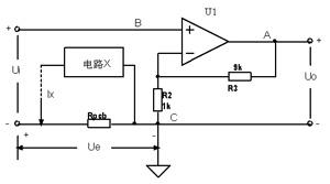 以图1所示电路为例,U1、R3、R2组成同相放大器,设计期望该放大器能够将输入信号Ui放大10倍,Uo是放大器的输出电压。由于PCB布局布线受到约束,Ui的“-”输入端子跟电阻R2的C端之间有一段导线Rpcb。而PCB上可能存在“电路X”引入地回流Ix流过导线电阻Rpcb。受“电路X”地回流Ix的影响,导线Rpcb两端会有电压差Ue,为了确定Ue对被测信号的影响,需要测量Ue的大小。