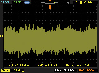 图3是用示波器测得的某个模数混合电路的模拟部分电源电压波形,由于示波器的带宽很大,波形中大部分是数字电路引入的宽带开关噪声,幅度为8.4mVpp。一般情况下,8.4mVpp电源纹波和噪声符合人们的“心理期望”,因而就认为电源没有问题(电源影响被低估)。