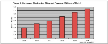预计2011年消费电子产品出货量将达到16亿个,而2010年是15.6亿个。消费电子包括多种我们熟悉的产品,消费者每天都会用到,如电视、立体声和音频部件、便携媒体播放器、机顶盒、游戏机、DVD和蓝光播放器、数码相机、投影仪和摄像机、数字相框、电子书阅读器和消费电器。