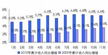 图1 2010年1~11月通信业收入累计增幅 ——移动电话用户增长再创新高,固定电话拆机放缓