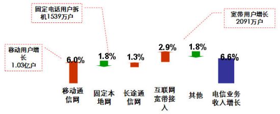 根据1~11月用户发展及各类业务的收入变化情况,对业务收入增长因素进行量化分析。结果显示,1~11月行业增幅达6.6%,最主要的增长拉动因素是移动用户的增长带来的收入贡献;第二位的增长拉动因素是互联网宽带用户的发展;而固网业务的进一步萎缩拉低了行业发展速度(见图2)。