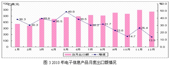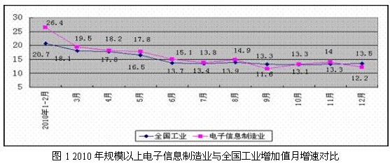 2010年是“十一五”规划收官之年,也是我国电子信息产业回升调整的重要一年,受扩内需政策成效显现和外需市场逐步回暖的共同作用,行业出现恢复性增长,总体呈现前高后稳态势。软件产业和对外贸易出现新突破,经济效益稳步提高,投资持续高位增长,产品结构调整深入,产业链向上延伸的趋势更加明 显,企业、市场和区位布局出现新趋向,行业为推动信息化发展和促进两化融合发挥积极作用,在国民经济发展和全球产业布局中日益占据重要地位。