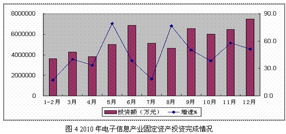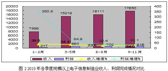 电子信息产业结构调整步伐加快。2010年,电子元器件行业销售产值分别增长29.4%和39%,出口交货值增长26.2%和41.7%,利润 增长61%和207.4%,成为拉动全行业增长的主要力量;软件产业保持31%的速度增长,占电子信息产业的比重达到18%。产业链不断向上延伸,多条 12英寸集成电路生产线建成投产,与发达国家差距逐步缩小;多条液晶面板生产线已投产,弥补了高世代生产线的空白。
