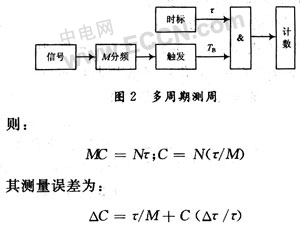 [page]误差中前项是量化误差,后部分是因为标准信号误差引起的。从式中可知,被测信号周期扩展M倍后,对时标信号的频率要求不很高,电路容易实现,并能将量化误差降到单周期测量的1/M;为减小标准信号带来的误差,要求时标信号具有较高的精度。