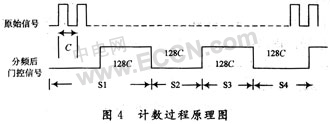 如图4所示,原始信号周期C在200μs左右,256分频后的门控信号周期在51200μs左右(256C),一个周期中高电平部分约为25600μs(高电平部分128C),在高电平时对5.5296MHz计数,其计数值约为141500,超过16位计数器的长度,将产生溢出并产生中断???个内部RAM,在中断服务子程序中进行加l操作,即可满足计数字长要求。计数过程如下: