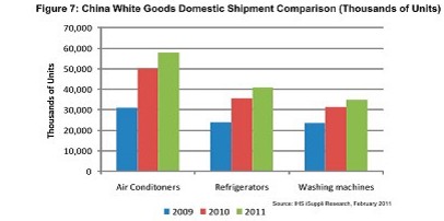 中国政府2010年旨在刺激本地消费的补贴计划,非常成功地刺激了中国白色家电市场。据IHS iSuppli公司的研究,2011年继续实施补贴计划将推动白色家电市场进一步增长。