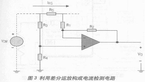 传统的高端/低端检流方式有多种实现方案,绝大多数基于分立或半分立元件电路。高端检流电路通常需要用一个精密运放和一些精密电阻电容,最常用的高端检流电路采用差分运放做增益放大并将信号电平从高端移位到参考地(图3):