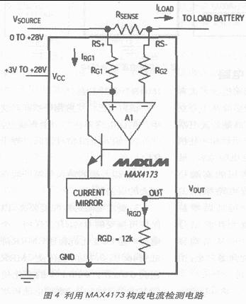 MAXIM推出了一系列双向或单向电流检测IC,有些双向电流检测IC内置检流电阻,可检测流入或流出被检电路的电流大小并通过一个极性指示引脚显示电流方向。增益可调的电流检测IC、固定增益(+20V/V,+50V/V,或+100V/V)电流检测芯片或包括单双比较器的固定增益电流检测IC,都采用小体积封装,如SOT23,可满足对尺寸要求苛刻的应用。图4是用MAX4173构成的高端电流检测电路。[page]