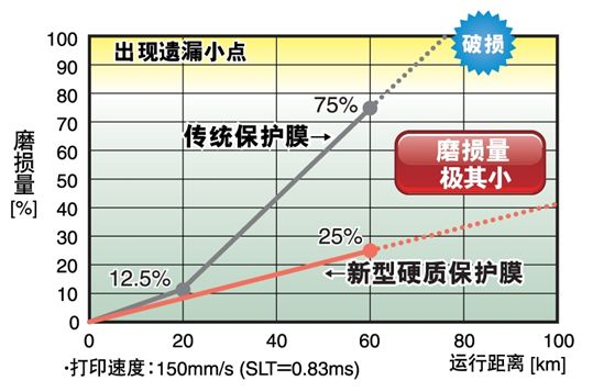 为了应对这种情况,采取了将打印头的保护膜材料变更为硬质材料等对策,但提高保护膜的强度的课题是?;つさ淖槌珊头⑷炔糠值男巫瓷杓?。在以往的产品中,使用某些劣质热敏纸时,使用寿命仅10km左右,这当然与打印机的使用频率也有关系,但发生过几个月左右就无法使用的案例。罗姆面对这种情况,一直致力于改善?;つげ牧现械挠仓什牧系慕峁购痛蛴⊥方峁?。这次开发的热敏打印头通过优化?;つげ牧系墓钩晌镏始捌渥槌桑蠓岣吡四湍バ?,实现了比以往产品高约3倍的耐久性(保证150km(以往产品是50km))。另外,通过提高?;つさ娜鹊悸?,打印效率也比以往改善了15%,同时还提高了打印质量。而且,这种打印头的形状保持与以往产品完全相同,因此无需进行打印机的设计变更,另外,这种规格还可以用于修补替换。