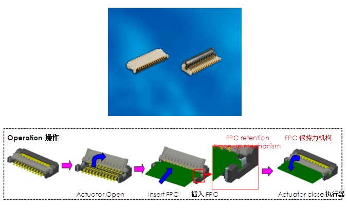 FCI提供的0.5毫米间距, 0.7毫米高度FPC 零插入力连接器可在高度极低的空间内提供可靠的连接。它是原SVL系列(0.5毫米间距和0.9毫米高度 ZIF)的升级版,而SVL系列已经被广泛地认为是零插入力连接器的标准,用于显示背光灯和可触摸屏式连接。该VLP0.7毫米高度系列具有相同的带电缆锁定功能及底部连接型式的后向触发执行器。