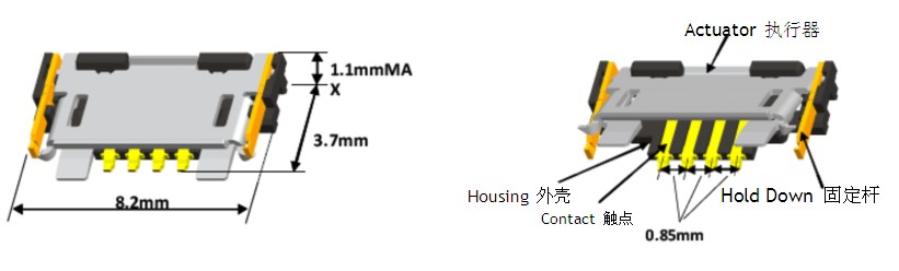 该连接器为0.2毫米(错位排列)连接间距,带有0.4毫米导向位。目前可提供11针和29针,计划最多达81针。连接器高度为0.9+/-毫米。其外壳材料为热塑塑料(UL 94V-0), 固定调整片和连接器的铜合金无卤素。作为底部接触型产品,因此可最为广泛地适用于掀盖式执行器,很方便进行关门操作。就连接器规格而言,连接器可通过带有外壳开槽结构的耳式电缆分割结构提供电缆预持功能。要求的电缆厚度是:0.2毫米+/-0.03