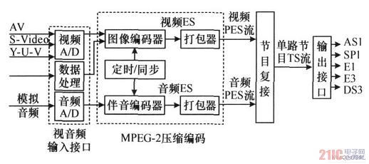 MPEG-2压缩编码器是将模拟电视视音频信号进行MPEG-2压缩编码输出实时TS流的前端设备,适用于数字电视的传输或前端信源编码以及会议电视、远程教育等各种应用,一台高级的编码器不仅具有DVB接口,还应当设有电信接口,以使该设备能方便地在HFC网络、微波MMDS或8GHZ系统、SDH或PDH等网络中应用,如图1所示。