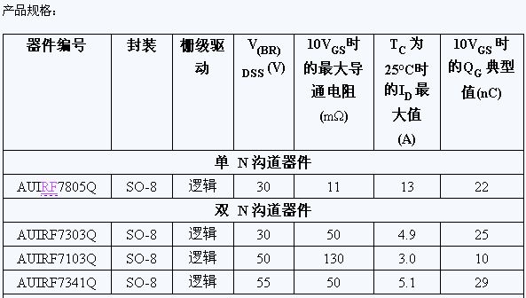 IR 亚太区销售副总裁潘大伟表示:“由于可以满足宽泛电压的要求并采用 SO-8 封装和 IR 的平面技术,我们的最新系列 MOSFET 可以提供坚固紧凑的解决方案,非常适合需要用坚固 MOSFET 驱动阻性和感性负载的应用。”